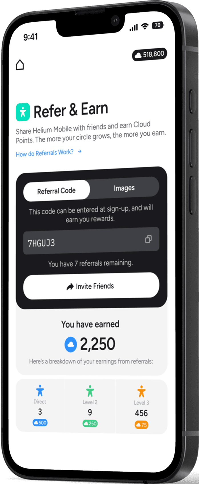Con Helium Mobile, una referencia puede desencadenar una cadena de recompensas. Refiere a un amigo, y ambos ganan $10 en Cloud Points. Pero se pone mejor—sigues ganando a medida que tu amigo refiere a otros, hasta 3 niveles de profundidad.